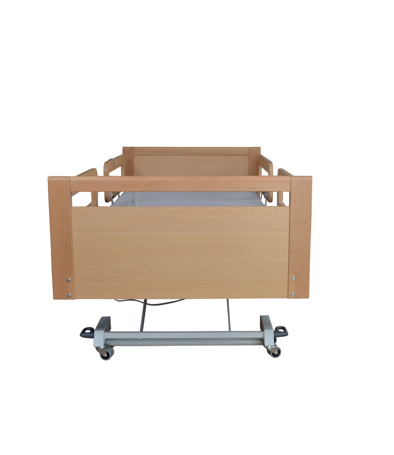 Das Niedrigbett Allegra 20.80 ist komplett unterfahrbar, was den Transfer des Patienten erleichtert und die Pflegeprozesse effizienter gestaltet. Der Holzlattenrost sorgt für eine angenehme Liegefläche und bietet gleichzeitig eine gute Belüftung.