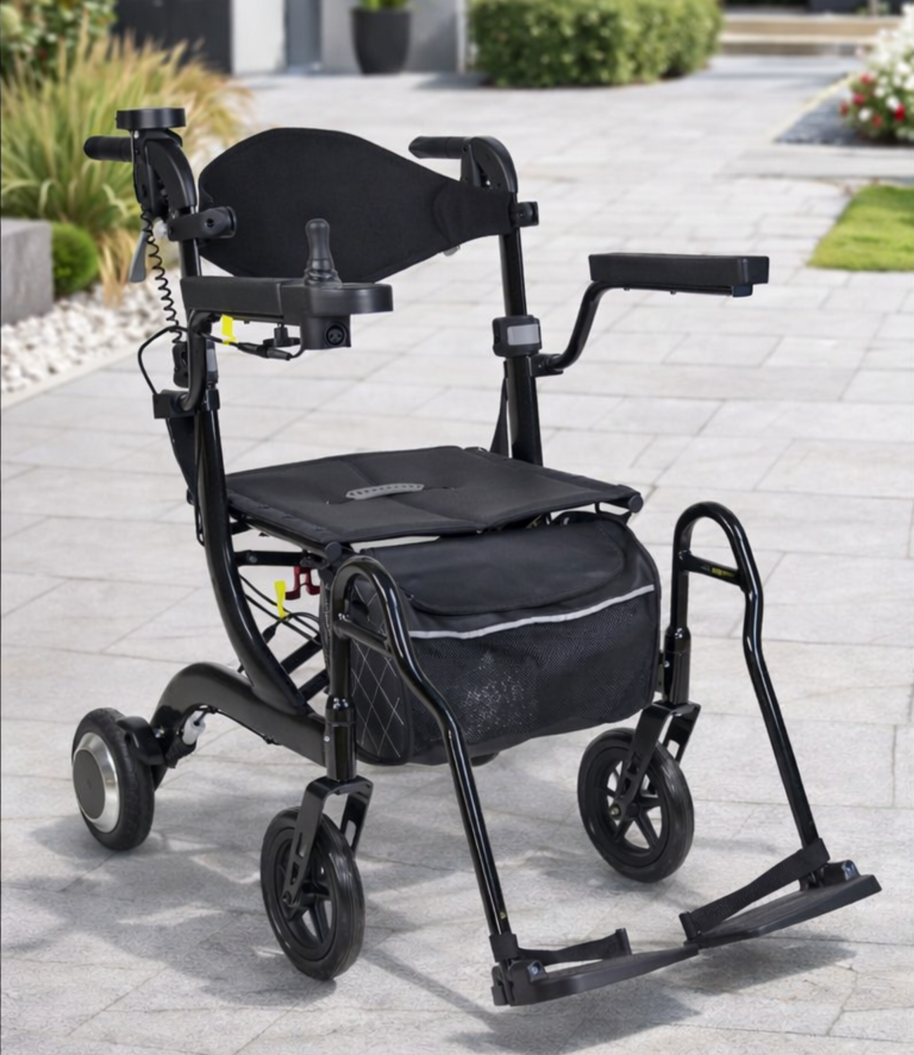 „Scorpus LF“ kombiniert die Funktionen eines klassischen Rollators mit denen eines motorisierten Hilfsmittels – so können Sie ihn je nach Situation entweder als unterstützende Gehhilfe oder als elektrischen Sitz-Rollator nutzen. Dank des elektrischen Antriebs überwinden Sie Steigungen mühelos, lange Strecken werden entspannter. Gleichzeitig lässt sich der Gerät kompakt zusammenklappen und bequem transportieren – etwa im Auto oder im Wohnraum.