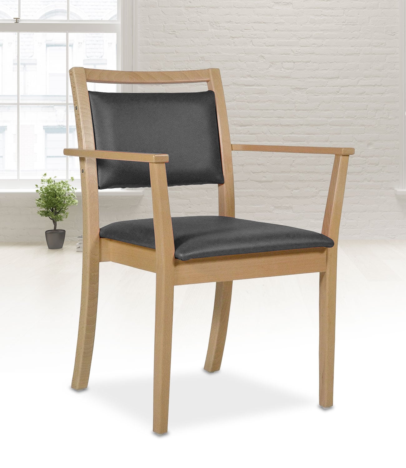 Dieser Seniorenstuhl ist aus massiver Buche gebaut und bietet guten Sitzkomfort und solide Verarbeitung. Er ist stapelbar und wird in verschiedenen Holzfarben angeboten. Das Einsatzgebiet liegt in Seniorenheimen und Kliniken, aber auch für Bewohnerzimmer und private Haushalte ist der Objektstuhl geeignet. Die Armlehne mit Knauf unterstützt beim Aufstehen und beim Hinsetzten.