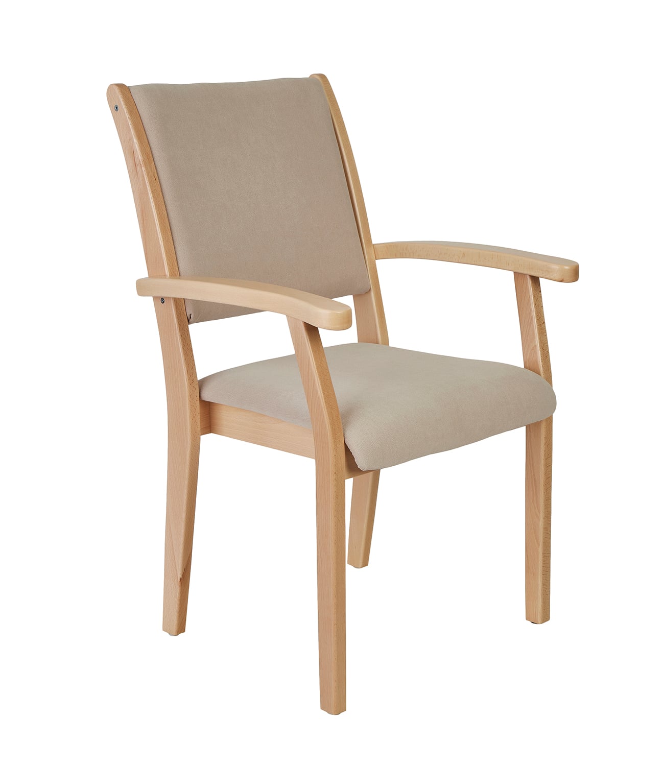Der Seniorenstuhl Kerry von Devita unterstützt das gemütliche und sichere Sitzen. Das Holzgestell und die Armlehnen geben Stabilität und Sicherheit im Alltag. Der Stuhl mit Armlehne kann in unterschiedlichen Sitzhöhen bestellt und somit optimal an die jeweilige Körpergröße angepasst werden. Eine höhere Sitzhöhe erleichtert das Aufstehen durch einen geringeren Kraftaufwand und kann Schmerzen bei unterschiedlichen Krankheitsbildern reduzieren. Für den Sitzkomfort sorgen der ergonomische Sitz und das Rückenpolster. Die Armlehne ist leicht geschwungen und hat vorne einen abgerundeten Knauf. Kerry wird im Standard mit Kunststoffgleitern geliefert und ist stapelbar. Der stabile Stuhl mit Armlehne eignet sich für den Einsatz in unterschiedlichen Innenräumen.